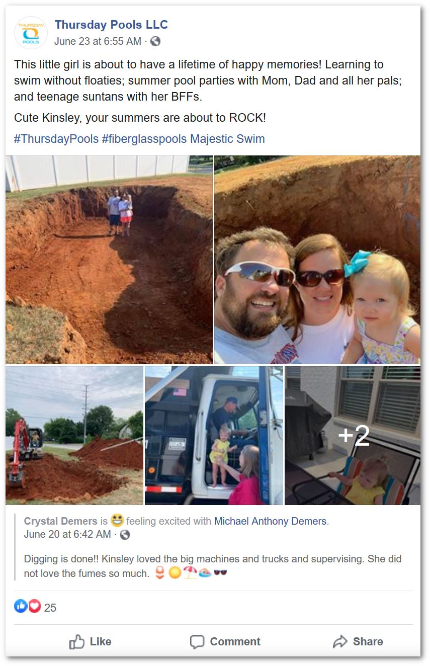 ✔ Great customer service keeps customers loyal long after the sale is complete. Thursday Pools has several customers who have not only purchased more than one pool throughout their lifetimes, but they also promote the brand to their own followers. It pays to take good care of the people who make your brand work!